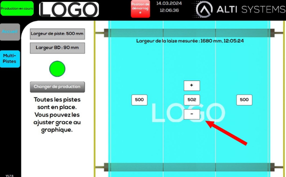 Le système intègre une interface de pilotage simple via un écran tactile. Tout le logiciel est conçu pour que vos opérateurs n’aient aucune question à se poser. Lors du pilotage du système, l’opérateur ne pourra pas faire d’erreurs grâce à des sécurités logiciels, exemple: l’opérateur ne peut pas demander 4 pistes de 500mm si la laize mesuré est de 1950mm. Le coffret de commande mesure 500x500mm et peut être monté ou vous le souhaité, il peut être directement intégré à une armoire existante simplement.